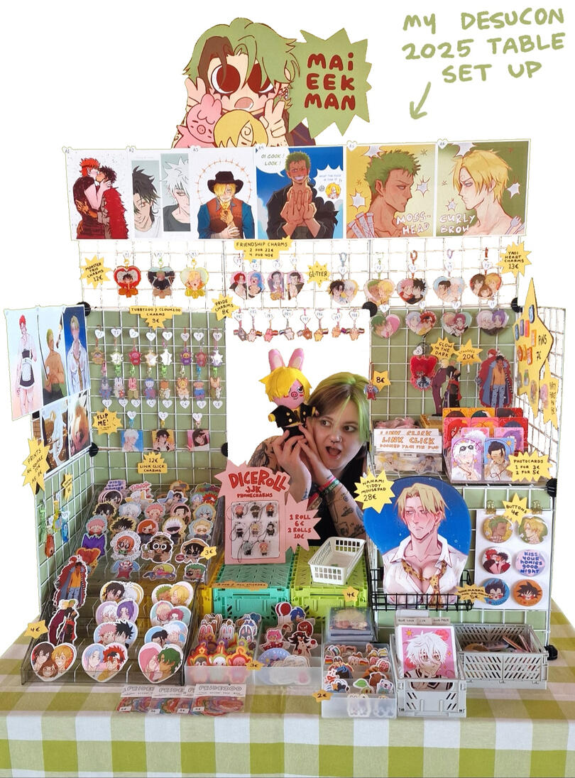 i'm mai, a 24-year old queer, non-binary artist from finland :•) i use they/he pronouns ! i love to draw and make merch of all the different things i love. i draw mainly yaoi-themed fanart, but i also have silly original characters i love deeply. you can find me online under the username maieekman.